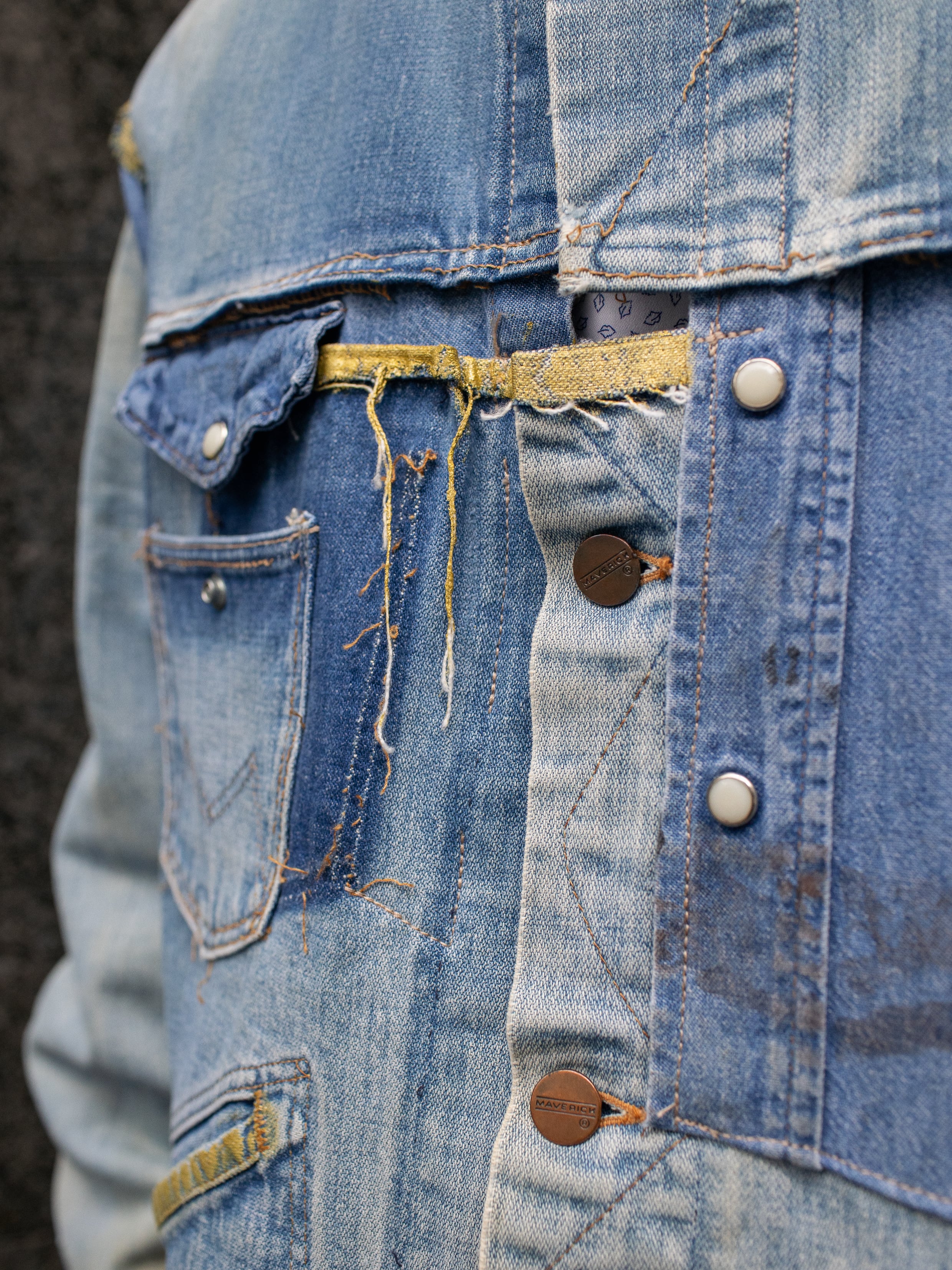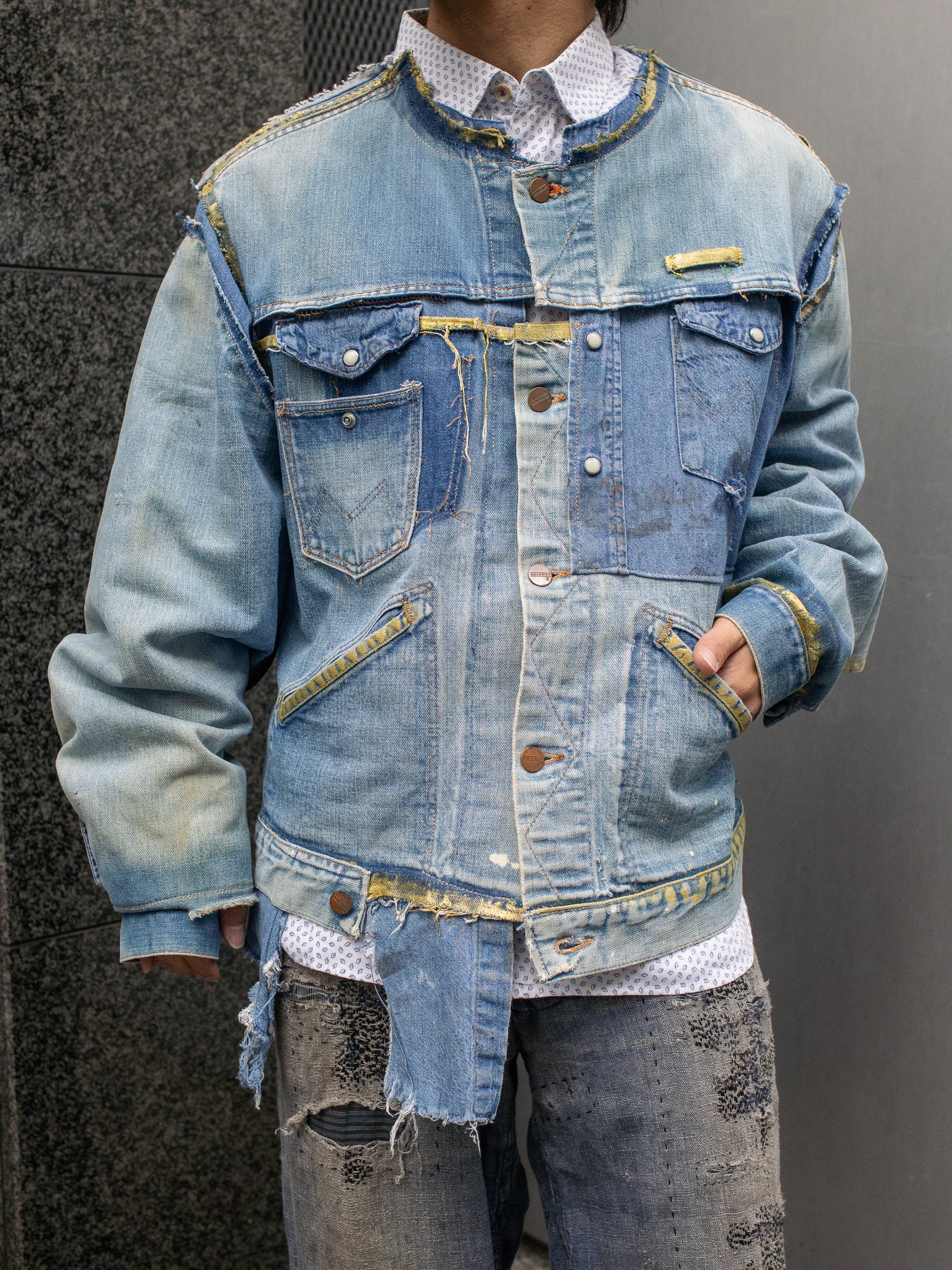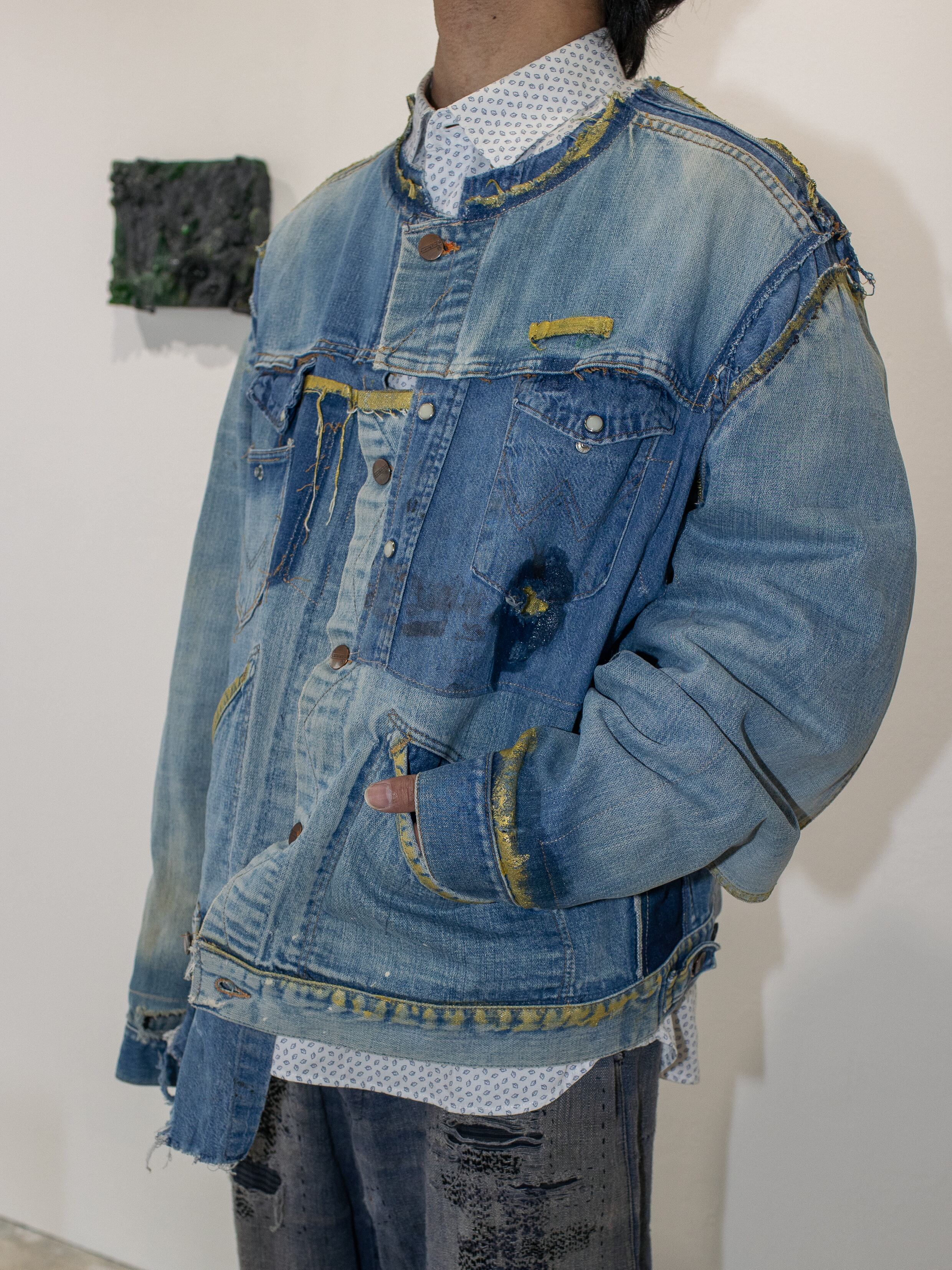 70年代のMaverickのデニムジャケットと80年代のWranglerのデニムシャツを脱構築的な表現でドッキング。年代を超えたブルーベルライン夢のコラボレーション。