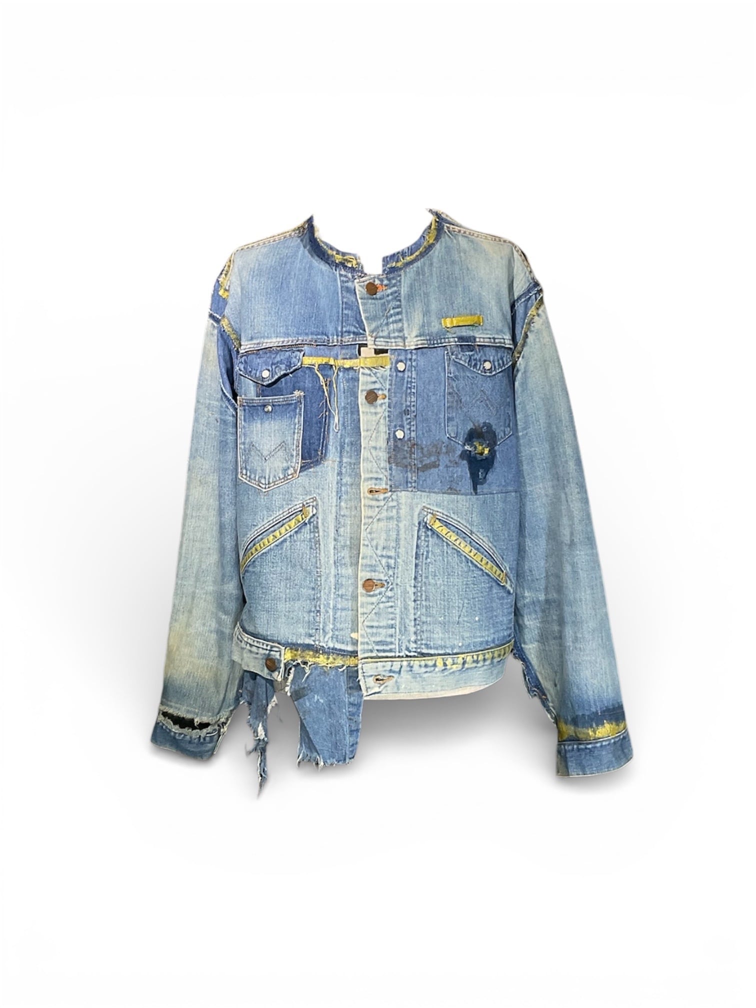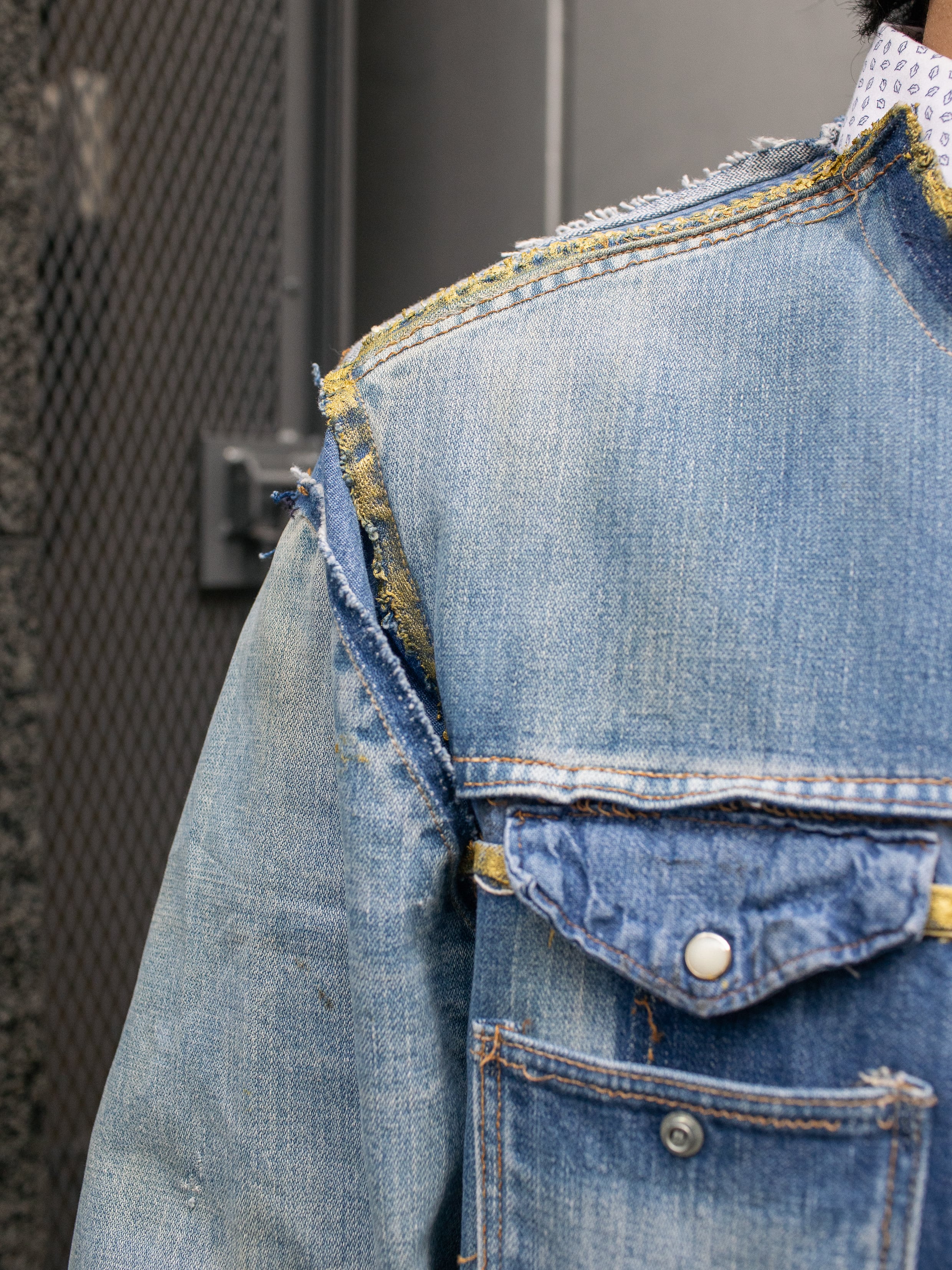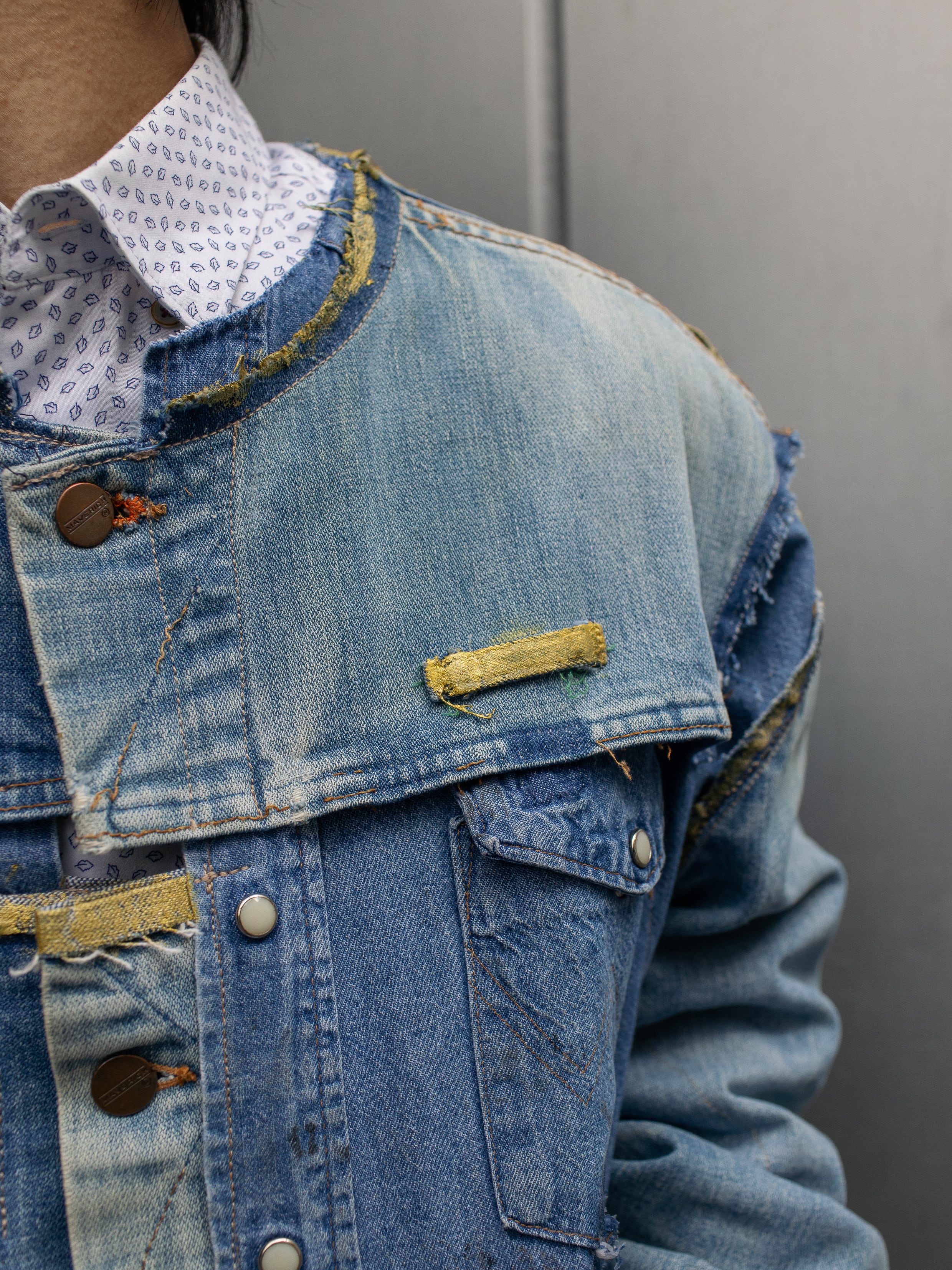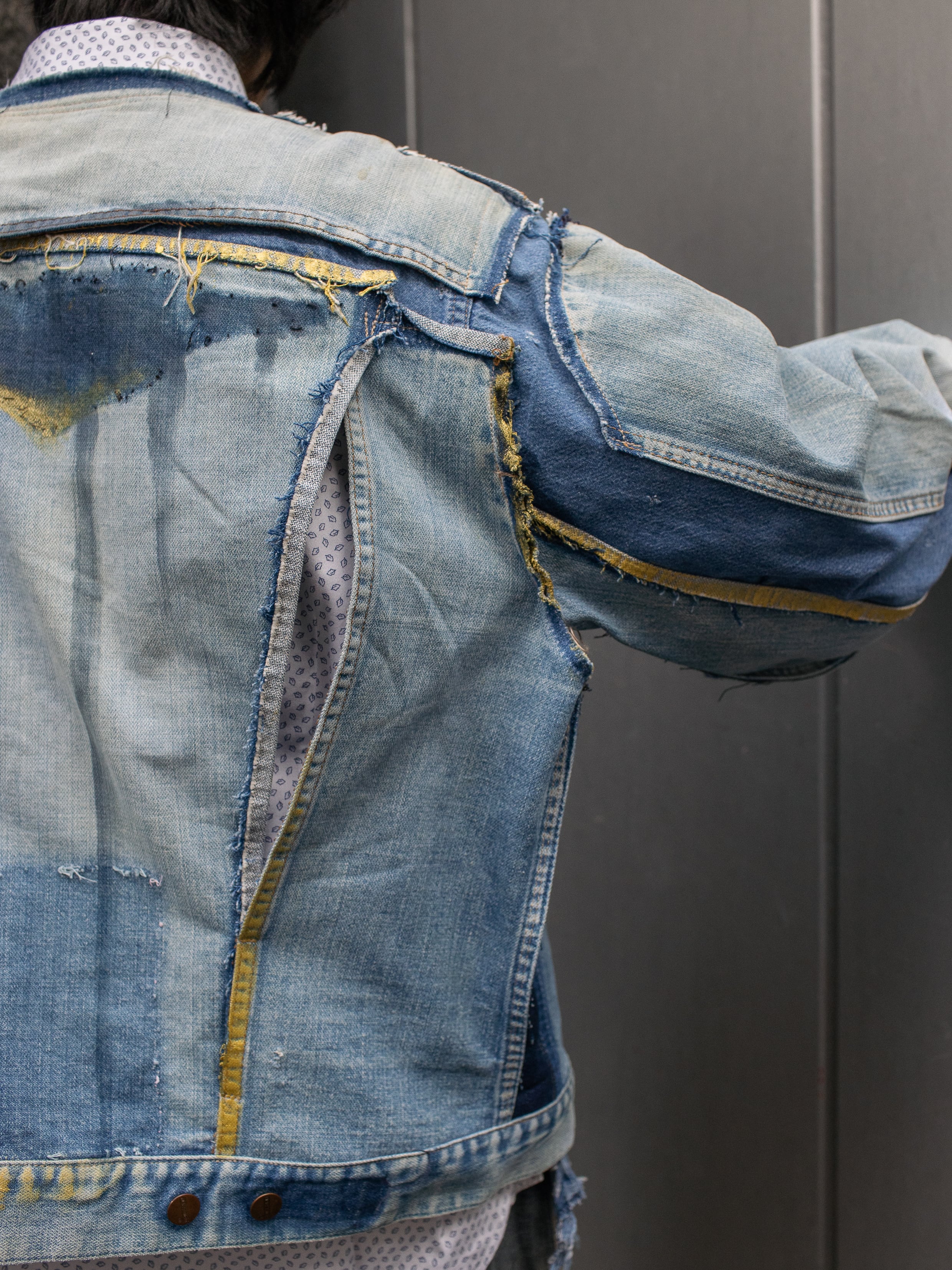 70年代のMaverickのデニムジャケットと80年代のWranglerのデニムシャツを脱構築的な表現でドッキング。年代を超えたブルーベルライン夢のコラボレーション。