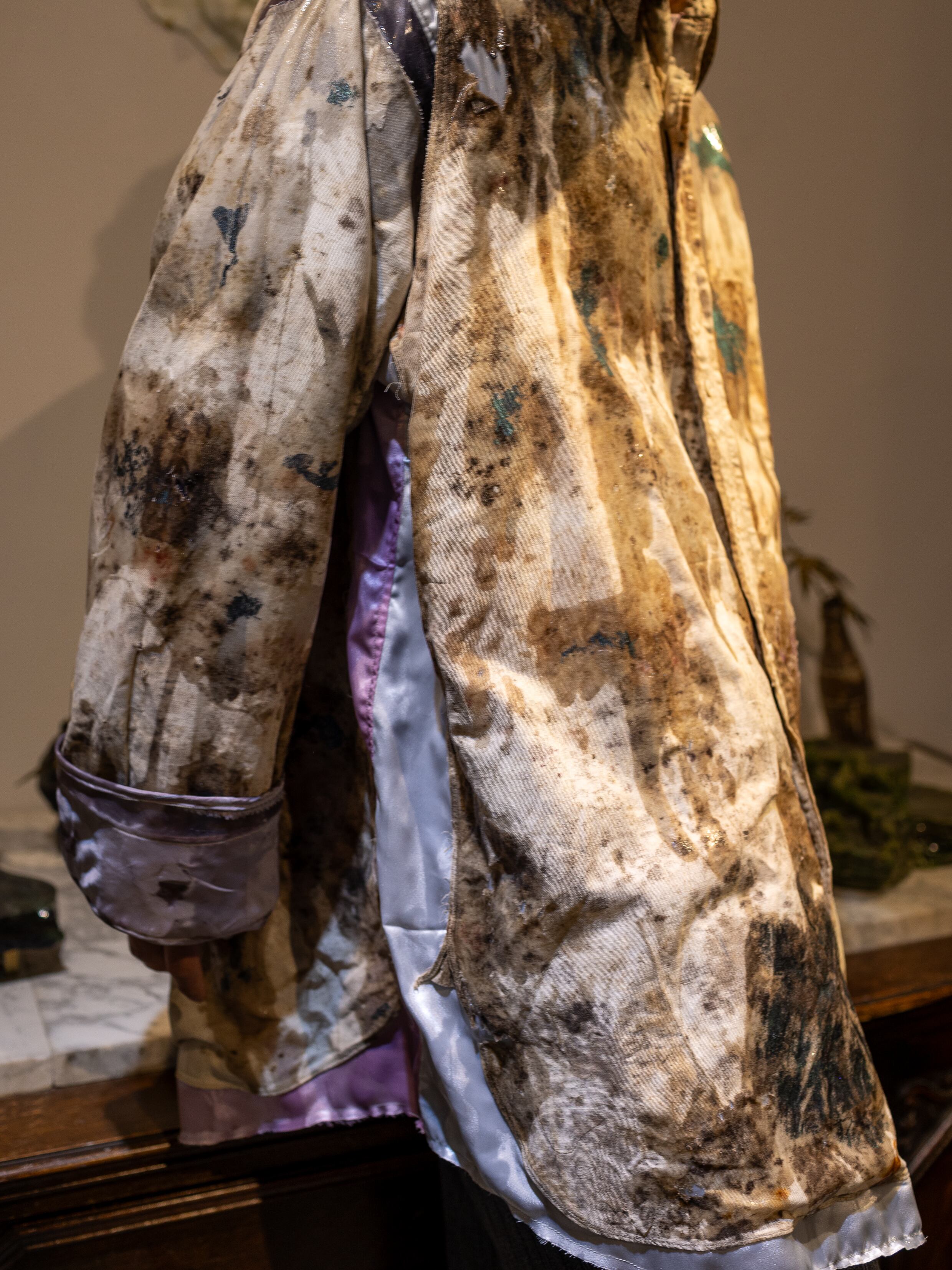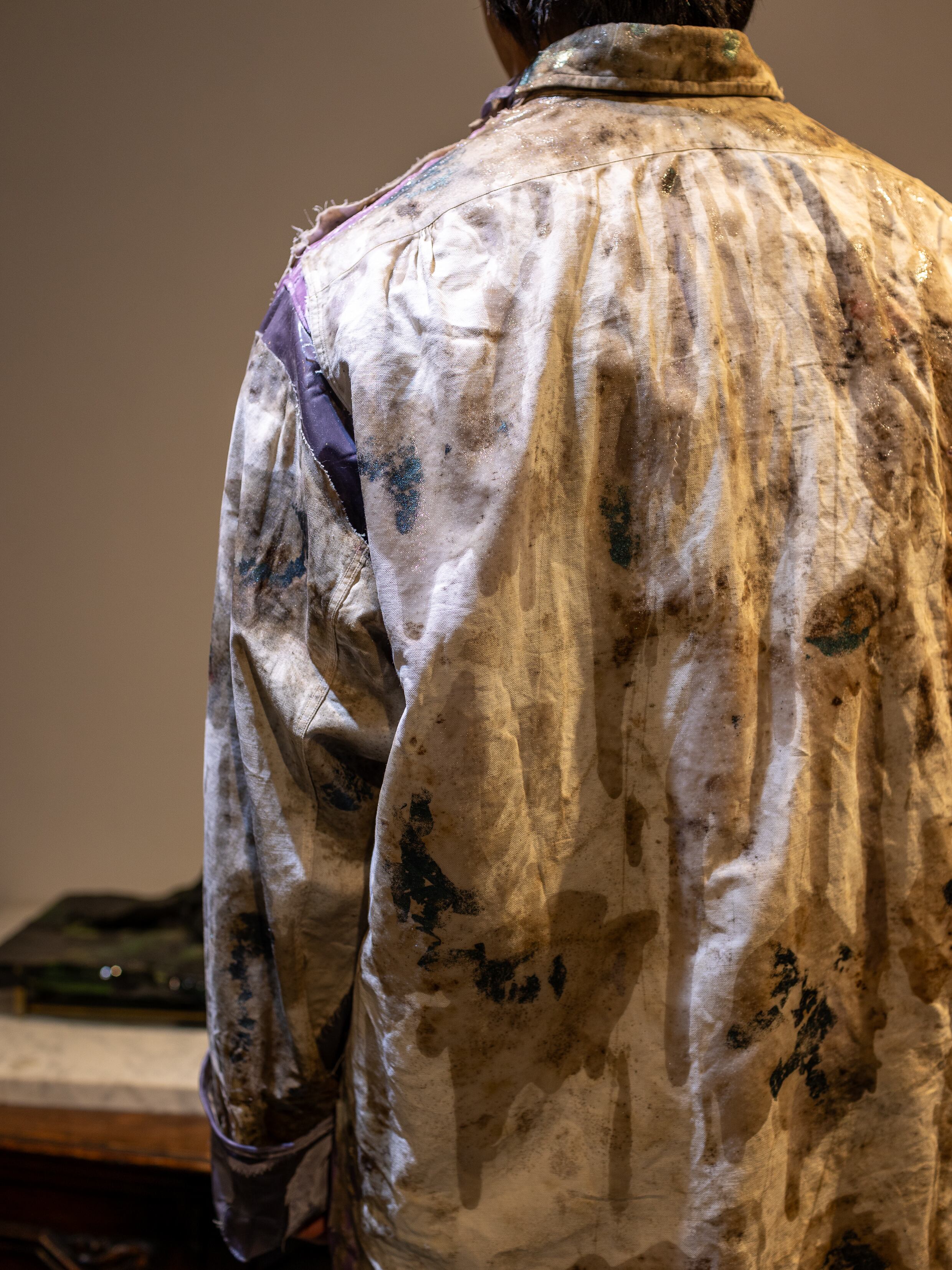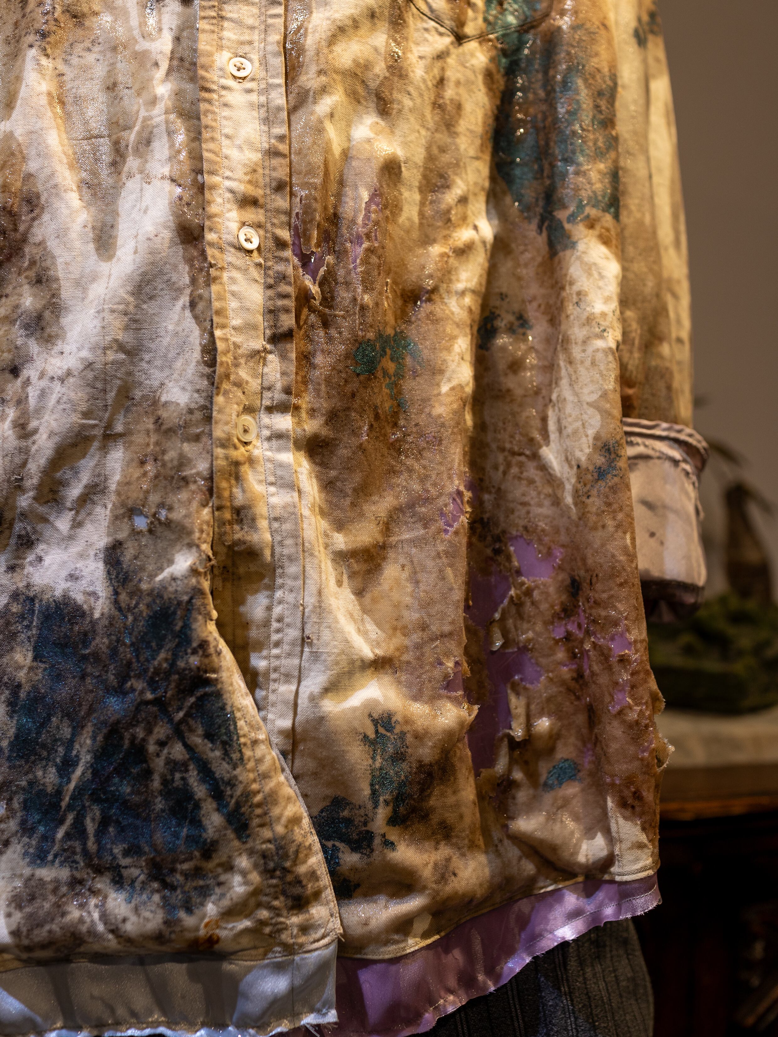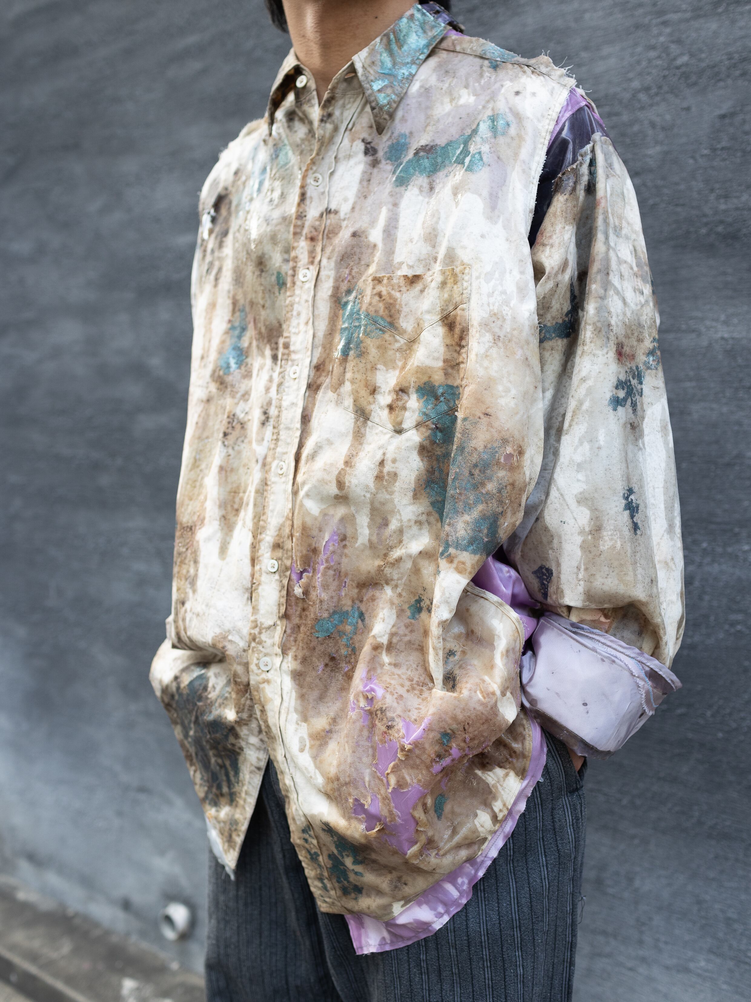 聖俗の境界を問うアプローチ。一旦バラバラにする事に固執したシリーズで、虚飾の象徴であるポリエステルサテンを使って再構築しています。膨大な時間に晒され風化した生地は抽象画のような美しさを秘めていますが、ただの耽美志向に向かわないように相対する素材をぶつけて加工を施す事で新たな価値観の視覚化を狙います。また、1920~1930年代のJ.C.PENNEYのワークシャツをベースとして起用しており、これを裁断する事でヴィンテージ市場のブランド主義化や情報の希少性に係るスペックの記号化に対するアンチテーゼの意味も込めています。